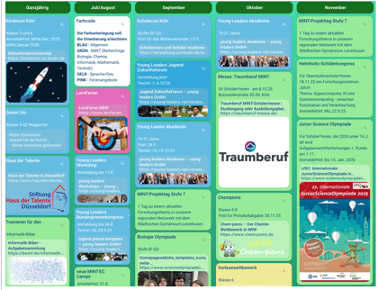 Eine Übersicht über die Angebote findet sich im Jahreskalender (s.u.). Wer Interesse daran hat, über weitere Möglichkeiten der Begabungsförderung informiert zu werden, kann sich hier in unseren Moodle-Kurs Begabungsförderung